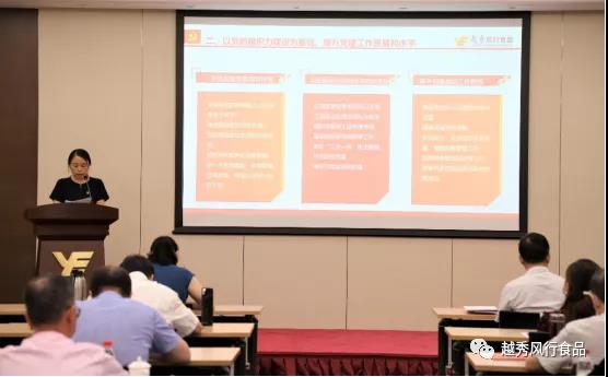 2020年7月27日上午,越秀风行食品在国贸大厦13楼会议室召开2020年度全面从严治党暨中期党建党风廉政建设工作会议。越秀风行食品及下属企业领导班子成员、本部中层以上管理人员及全体党员、各下属企业党、纪、工、团、人力资源部门负责人、各基层党组织负责人、受表彰的“两优一先”以及公司入党积极分子,共148人参加会议。越秀集团党委工作部、综合室和纪检监察室相关领导到会指导,会议由越秀风行食品临时党委副书记常芳主持。